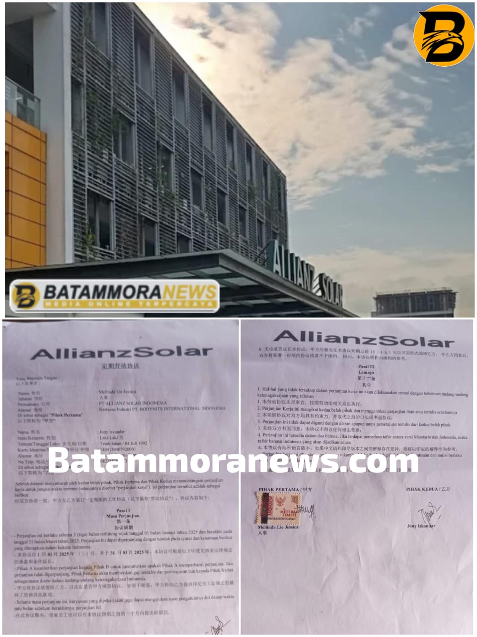 Batam – Dugaan pengabaian hak pekerja kembali mencuat di Kota Batam. Kali ini, kasus tersebut diduga terjadi di perusahaan PT Allianz Solar Indonesia, setelah seorang mantan pekerja mengaku diberhentikan secara sepihak tanpa prosedur resmi, tidak diberikan hak atas BPJS Ketenagakerjaan dan Kesehatan, serta adanya indikasi pungutan liar (pungli) dalam proses rekrutmen karyawan.