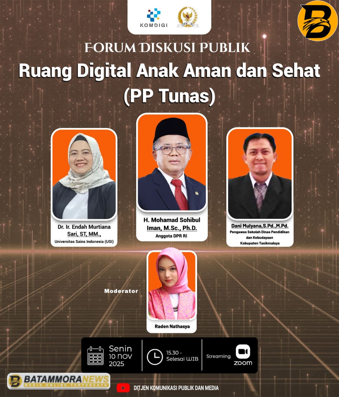 Batam – Kementerian Komunikasi dan Digital Republik Indonesia (KOMDIGI) bekerja sama dengan DPR RI menggelar Forum Diskusi Publik dengan tema “Ruang Digital Anak Aman dan Sehat (PP Tunas)”, Senin (10/11/2025).
