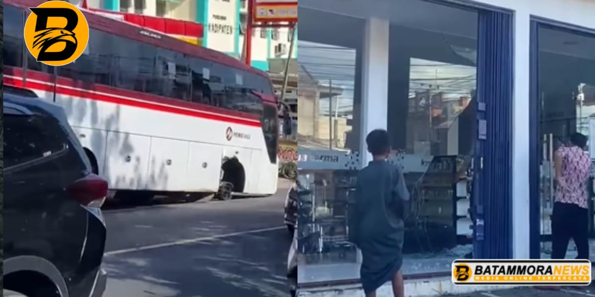 Saat itu, ban bus tersebut meluncur deras sampai menghantam kaca bangunan apotek yang berada tepat di kawasan pertigaan.
