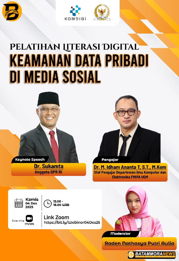 Nasional – Kementerian Komunikasi dan Digital Republik Indonesia (Komdigi) bekerja sama dengan DPR RI melaksanakan kegiatan Pelatihan Literasi Digital bertema “Keamanan Data Pribadi di Media Sosial.” Acara ini dibuka pada Kamis (04/12/2025) melalui platform Zoom Meeting dan diikuti sekitar 198 peserta.