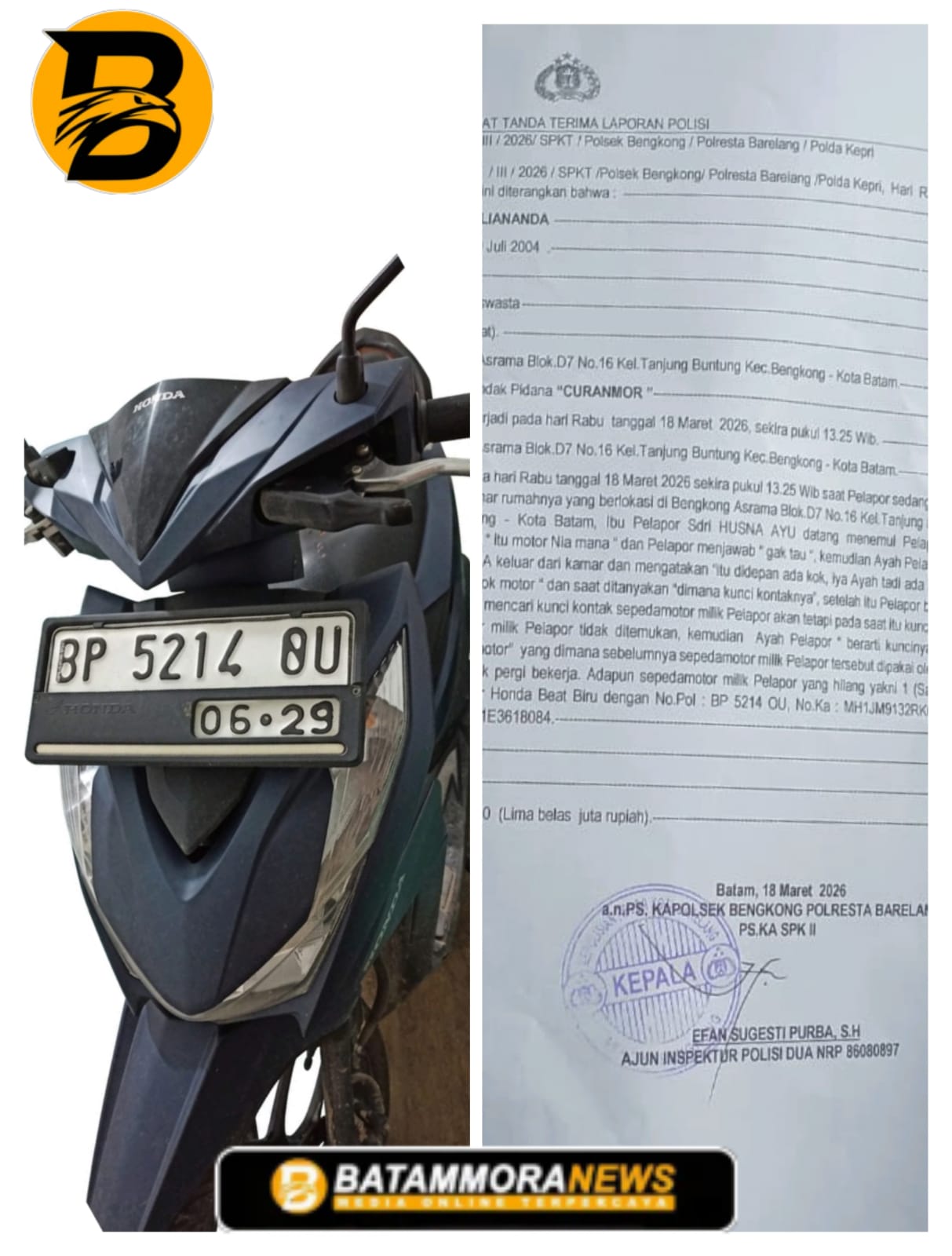 Adapun kendaraan yang hilang diketahui merupakan 1 (satu) unit sepeda motor Honda Beat berwarna biru dengan nomor polisi BP 5214 OU, nomor rangka MH1JM9132RK622567 dan nomor mesin JM91E3618084.