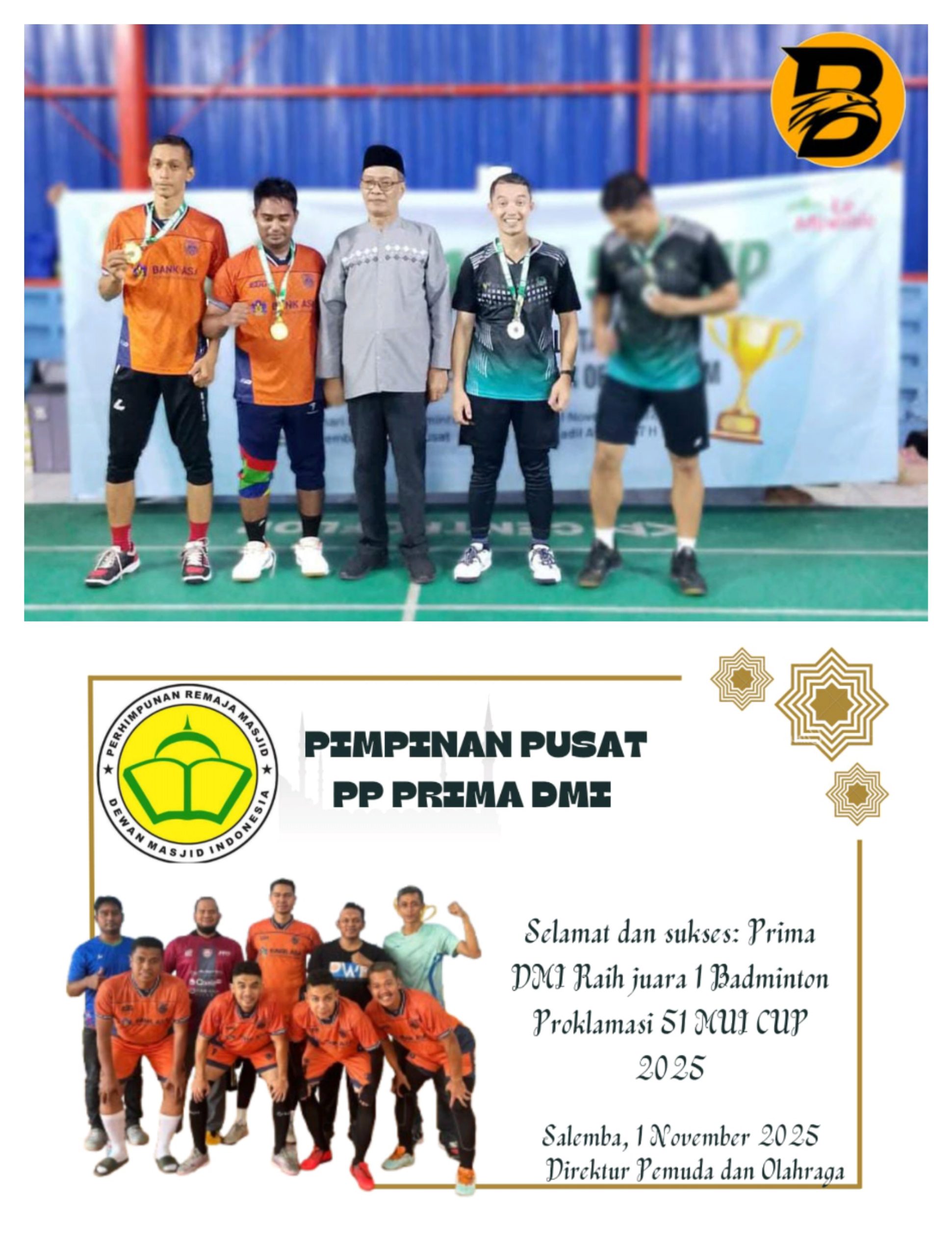 Jakarta — Tim Badminton PRIMA DMI (Perhimpunan Remaja Masjid Dewan Masjid Indonesia) berhasil meraih Juara 1 dalam ajang Turnamen Proklamasi 51 Cup MUI yang diselenggarakan oleh Majelis Ulama Indonesia (MUI) di Lapangan Futsal Kenari, Salemba, Jakarta Pusat, Sabtu (1/11/2025).