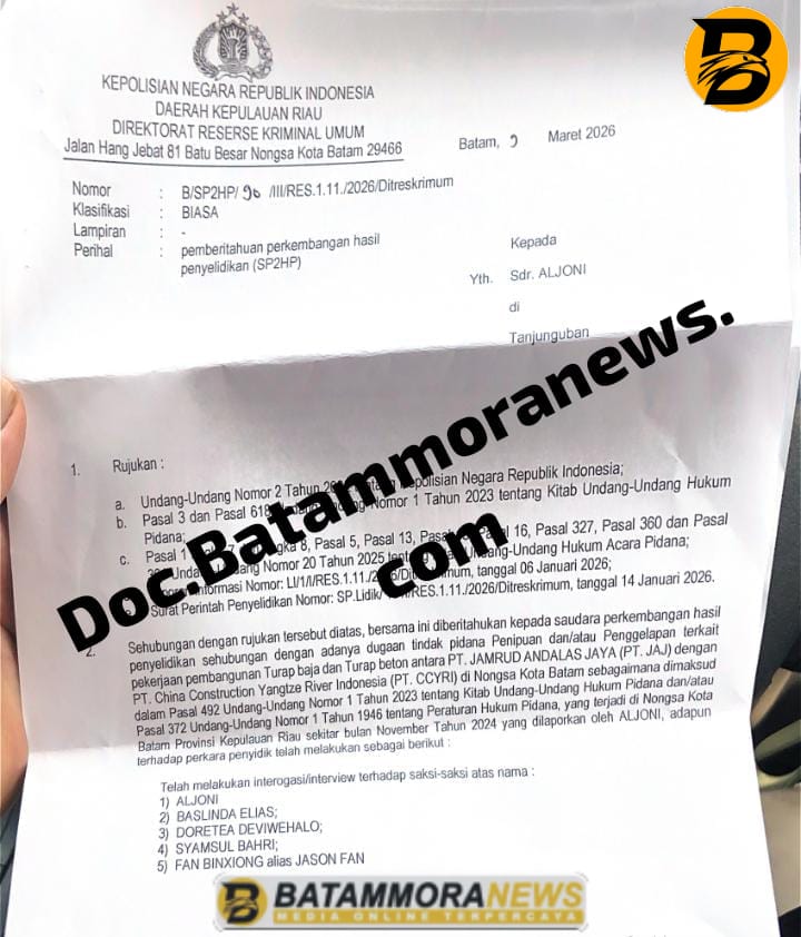 Batam – Batammoranews.com – Proses penanganan laporan dugaan perkara yang melibatkan PT China Construction Yangtze River Indonesia (CCYRI) di Polda Kepulauan Riau terus berjalan. Bahkan penyidik telah menerbitkan Surat Pemberitahuan Perkembangan Hasil Penyelidikan (SP2HP) sebagai bentuk transparansi perkembangan perkara kepada pelapor.