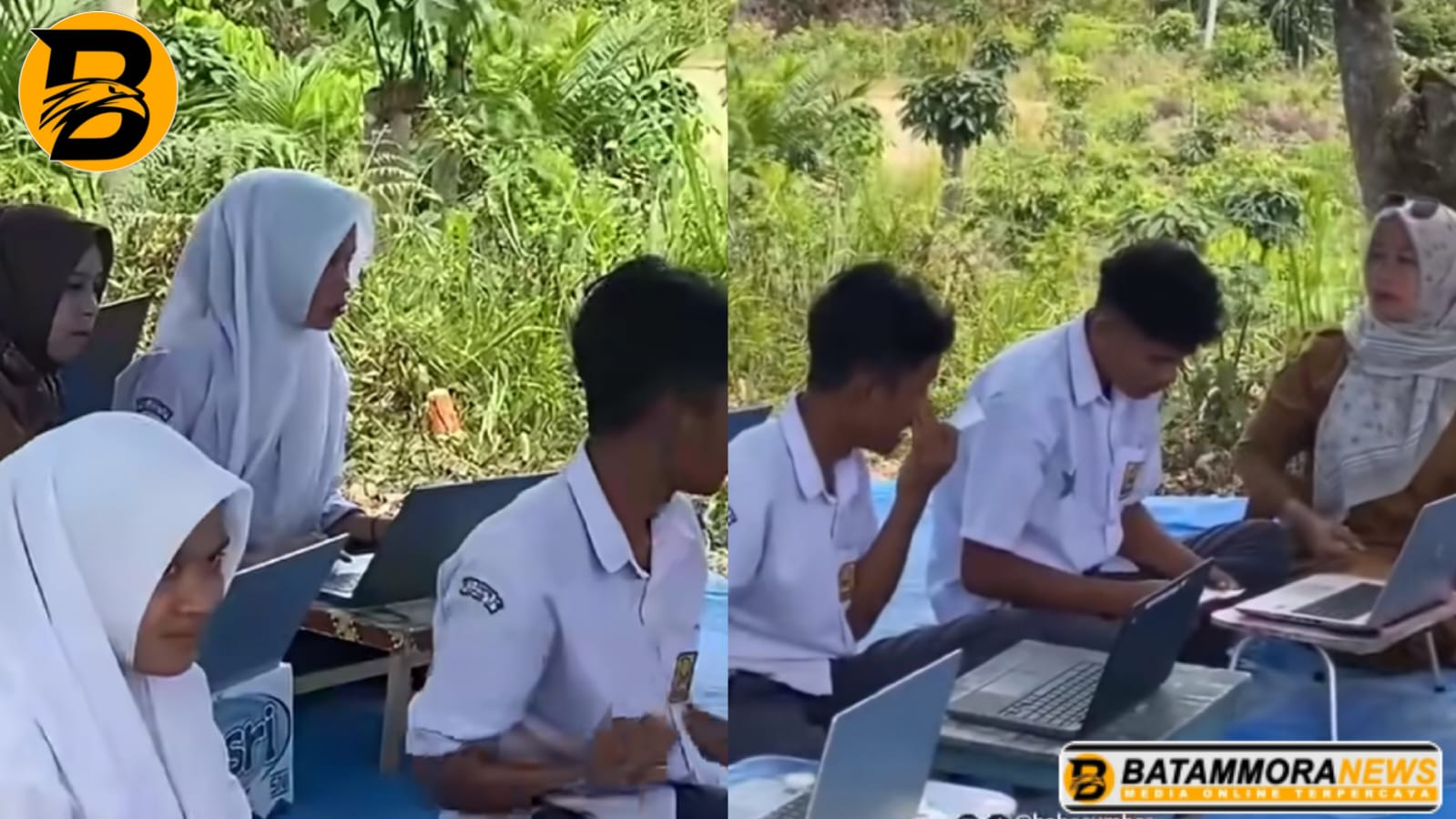 Dalam video, terlihat para siswa duduk lesehan dengan alas dan atap terpal warna biru, dikelilingi pohon-pohon perbukitan.